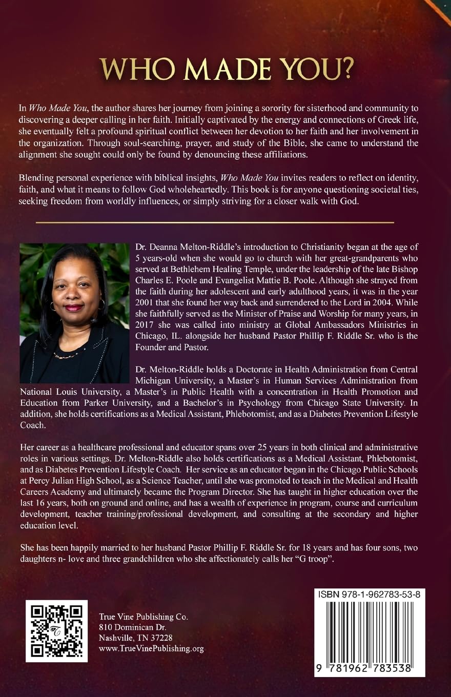 In Who Made You? the author shares her journey from joining a sorority for sisterhood and community to discovering a deeper calling in her faith. Initially captivated by the energy and connections of Greek life, she eventually felt a profound spiritual conflict between her devotion to her faith and her involvement in the organization. Through soul-searching, prayer, and study of the Bible, she came to understand the alignment she sought could only be found by denouncing these affiliations.
